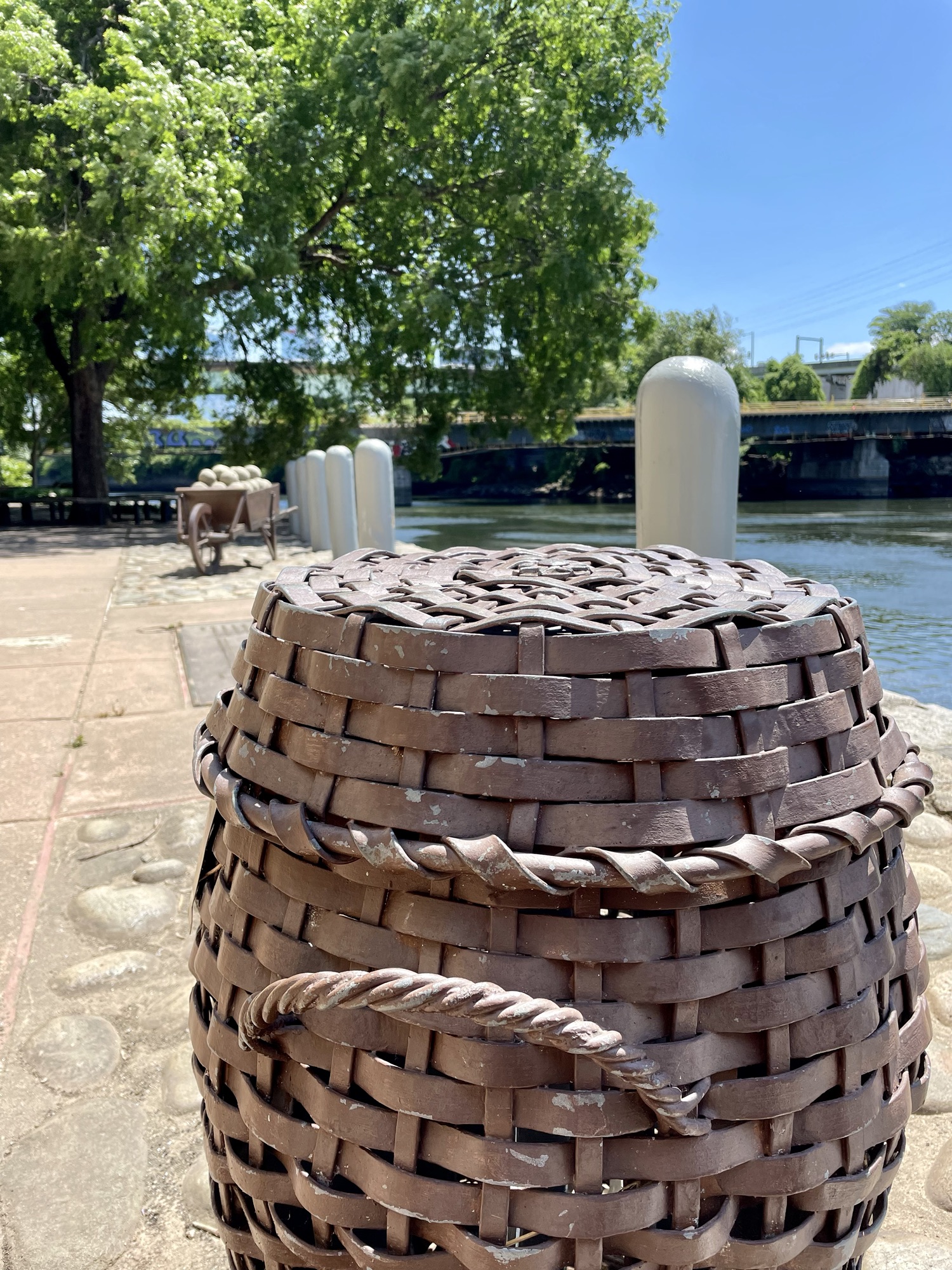 WAY off the beaten path (down a small staircase to the left of the Waterworks), hidden down at river-level, is a sculpture garden focusing on the history of the Schuylkill River – from a source of food for the native Lenape and resource utilized by colonists, through its emergence as a manufacturing hub during the Industrial Revolution – and its return to health as a fishery and public resource. We have occasionally come across art students sketching, but often have the place totally to ourselves.