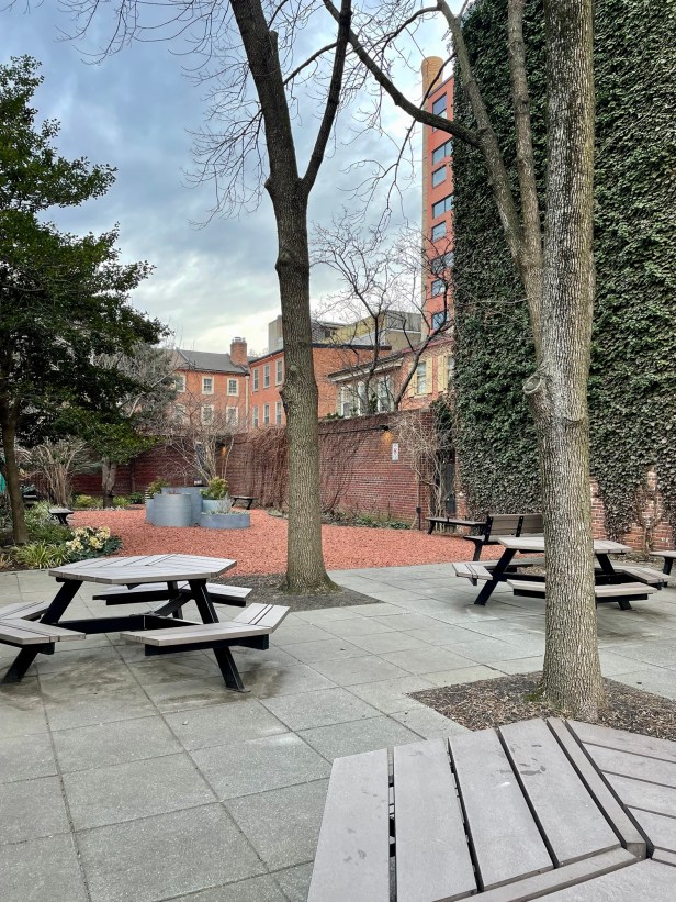 Many of our favorite Center City restaurants have limited seating. Since we don’t have an office or apartment nearby, we’ve had to track down other places to enjoy our food. There are plenty of benches around Independence Mall for picnicking in Old City, and there are beautiful gardens around the art museum. But, there are no real parks near many of our favorite Center City restaurants. Luckily, we’ve found some hidden areas where we can picnic on a nice day – and an indoor area for bad weather.