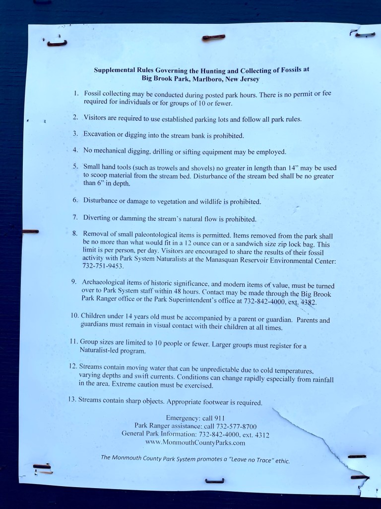 During the Cretaceous Period (about 145-66 million years ago), this part of New Jersey (in fact, much of North America) was covered by a shallow sea teaming with marine life. Today, Big Brook (actually the brook is fairly small!) cuts through these sediments, exposing the fossilized remains of these marine (and occasionally terrestrial) species.