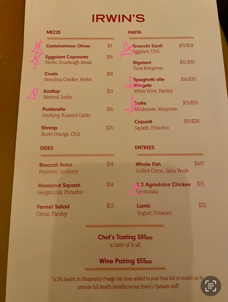 Irwin’s, a sit down restaurant with views to the stadiums, occupies the other side of the roof. It’s popular, so reservations are definitely recommended. The food is Italian, and the vibe is high school chic. Fun!