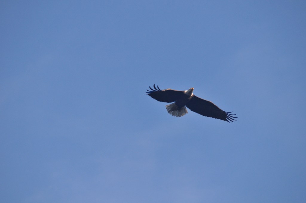 The adults are easy to spot with their distinctive white heads and tails, although almost half the birds we saw were juveniles. Eagles don’t get the full adult plumage until they are 5 years old.
