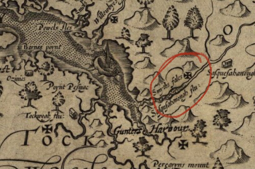 This location marks the highest navigable part of the Susquehanna River. John Smith (of Pocahontas fame) made it here in 1608, during his exploration of the Chesapeake Bay – he marked the spot “Smyths Fales” on his map of Virginia, which was the definitive guide for explorers in the region for over 70 years. John Smith’s life is fascinating. He was so much more than just Pocahontas – mercenary in the war of Dutch Independence, beheader of Ottoman Turks, slave to a Turkish concubine, traveler to Russia and North Africa, traitor to/then savior of/then traitor to/then savior of Jamestown, escaper of pirates, cartographer (and namer) of New England – a lot of adventuring to squeeze into 51 years!