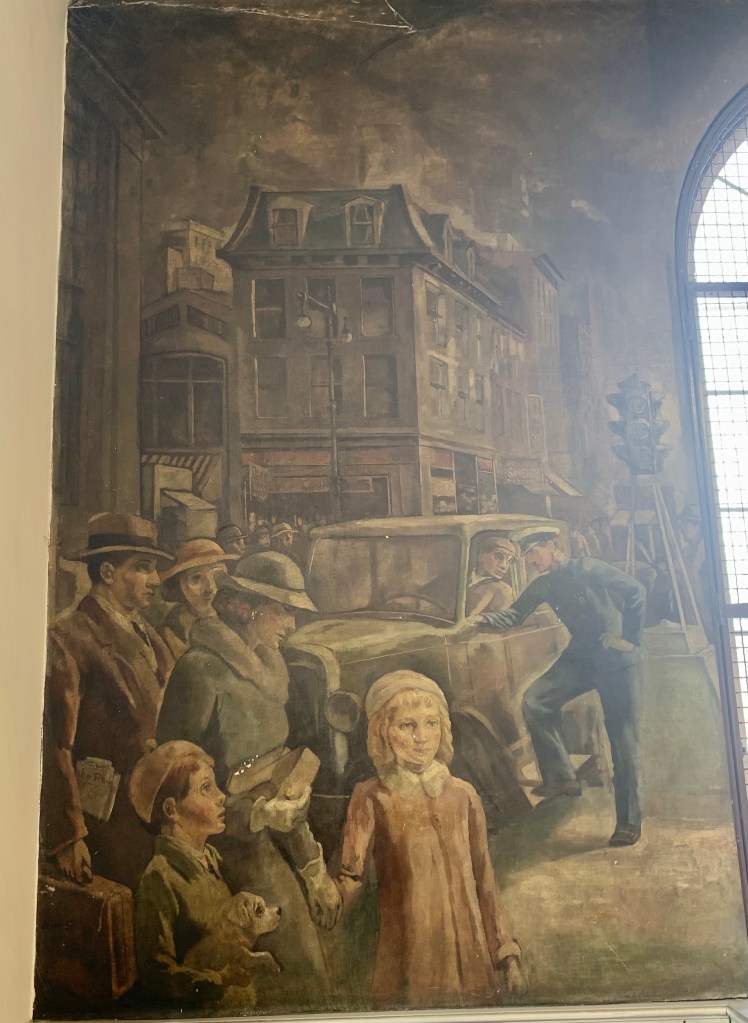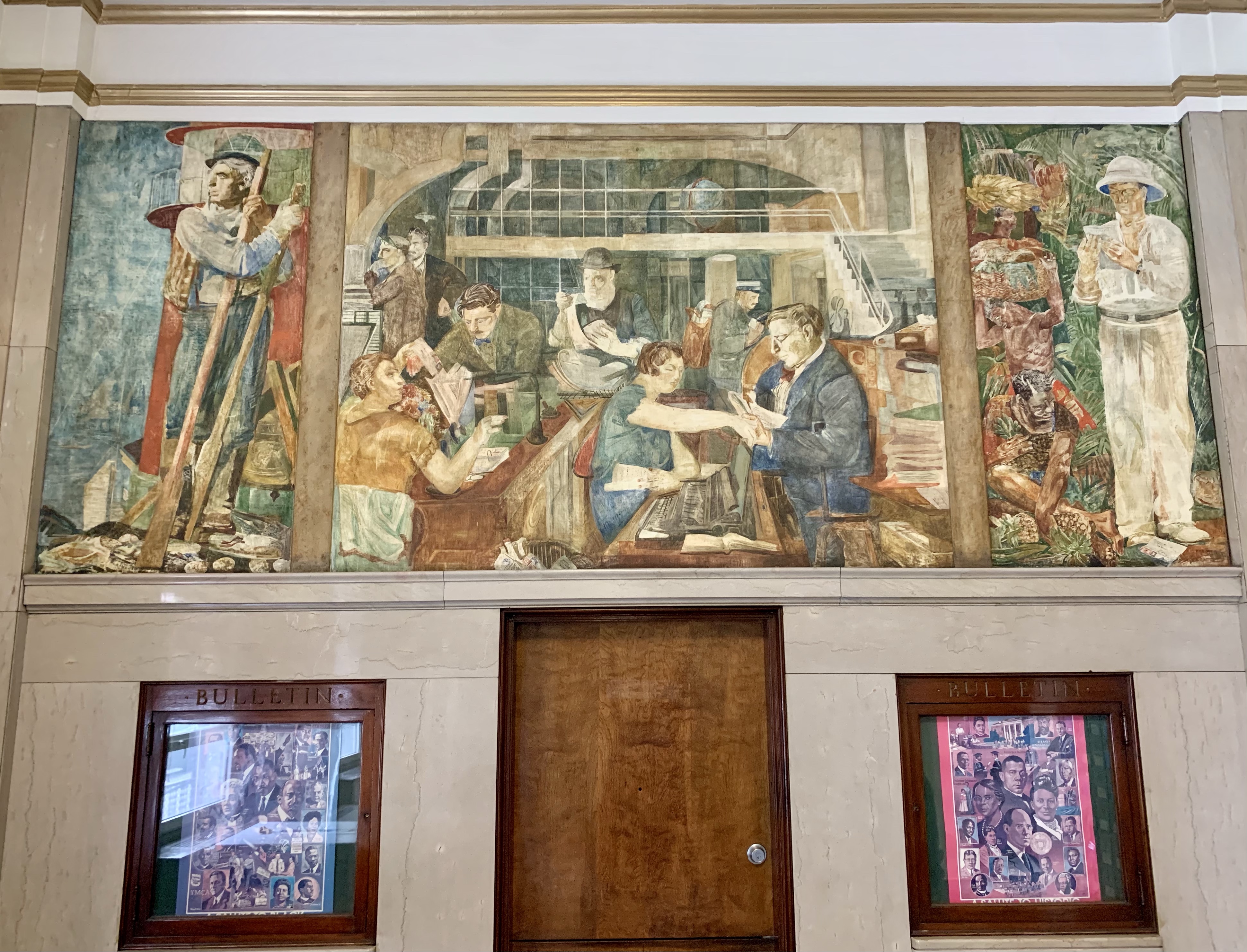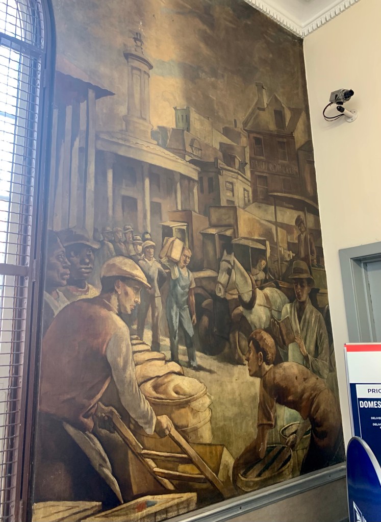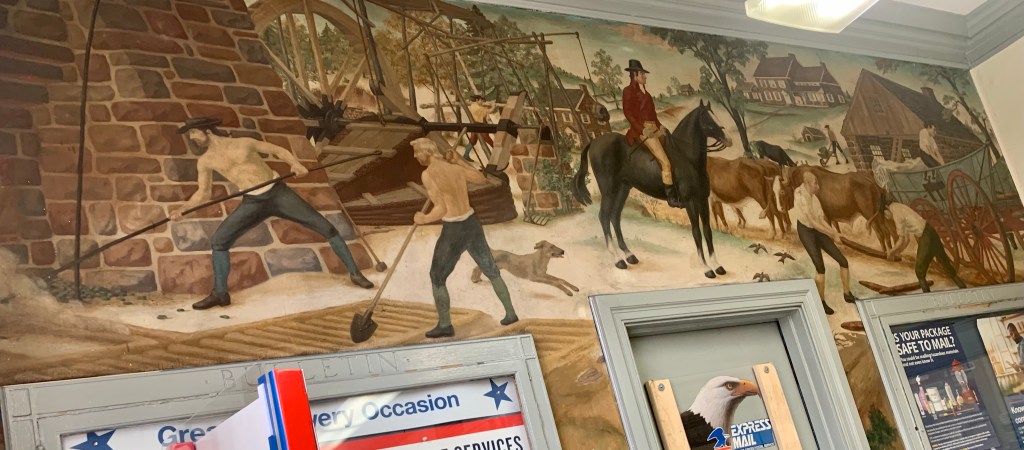 One New Deal program, called the Public Buildings Administration, was set up to construct and operate federal buildings, such as the customs house, schools and post offices. In addition to building, it also hired muralists to decorate them with paintings designed to boost the moral of citizens suffering hardships of the depression (figuring that folks from all walks of life eventually ended up in a post office), so they typically depict local events, local people and local folk lore. Of the 1400+ post office murals created, 3 Philadelphia post offices still have their original murals: