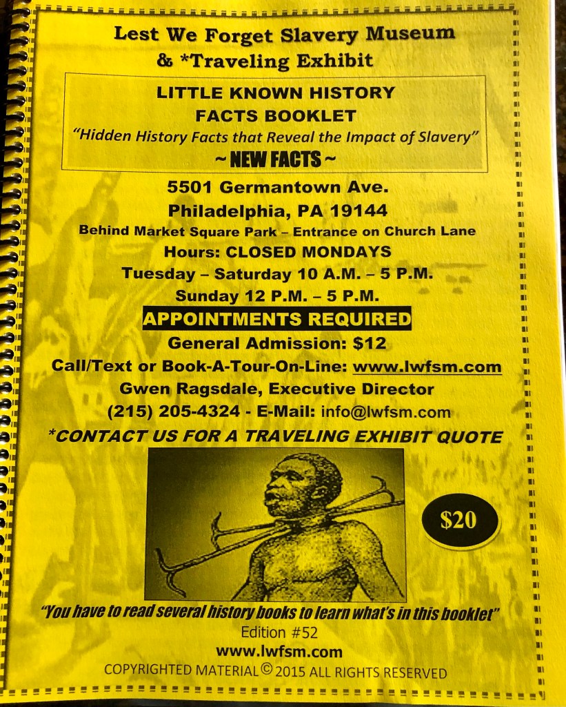 Tucked into two small rooms under the Germantown Historical Society, this is one of Philadelphia’s best secret museums. A collection of slavery artifacts that is centered around the personal collection of director, Gwen Ragsdale, and her husband, Justin, who began the collection with a slave collar (shown by Erick in the photo). He found it hidden away in a trunk after the death of his “Uncle Bubb,” whom he spent summers with in the south as a child.