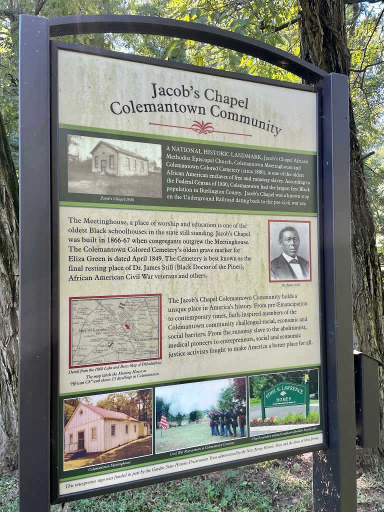 You can find James in Jacob’s Chapel Cemetery in Mt. Laurel, NJ. The site is home to one of the earliest African American burial grounds in NJ (Colemantown had one of the largest free black communities in the county), and is also home to an 1858 AME church and the early 19th century Colemantown Meetinghouse. The meetinghouse, moved here from near James’s home in Medford, is one of the oldest black schoolhouses in NJ and was a stop on the Underground Railroad.