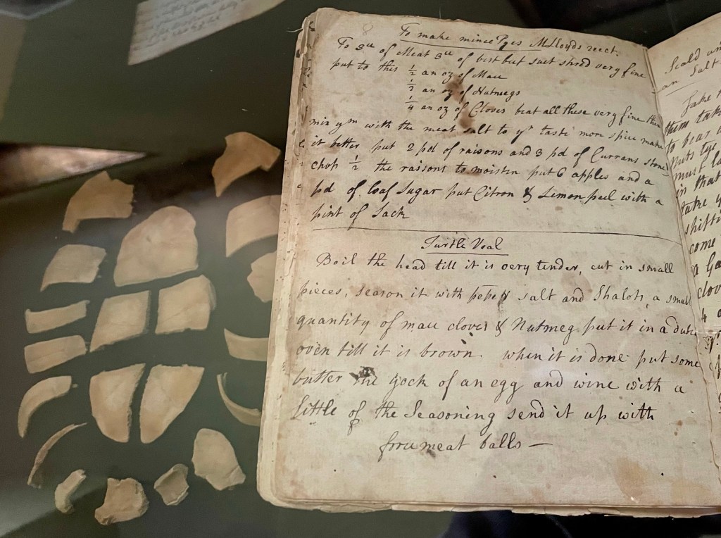 Kitchen: Love these displays of food remains found during archaeological excavations, along with period recipes from the collection. Turtle Veal, anyone?