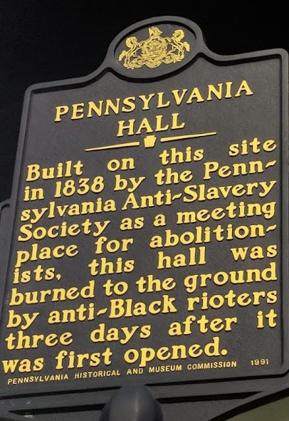 Southern transplants, Sarah (1792-1873) and Angelina Grimke (1805-1879) moved to Philadelphia to join both the abolitionist, vegetarian and feminist/suffragette movements. Both became well known (and extremely controversial) public speakers and writers, and it was Sarah that Ruth Bader Ginsberg quoted when arguing before the supreme court: “I ask no favor for my sex. All I ask of our brethren is that they take their feet off our necks.” In 1838 it was the combination of Angelina’s wedding (with both black and white ministers speaking, and both black and white guests attending) followed by Sarah’s anti-slavery speech at the inauguration of Pennsylvania Hall, (a building bankrolled by the Pennsylvania Abolitionist Society) that set off the anti-abolitionist mob that burned Pennsylvania Hall down just days after its opening.