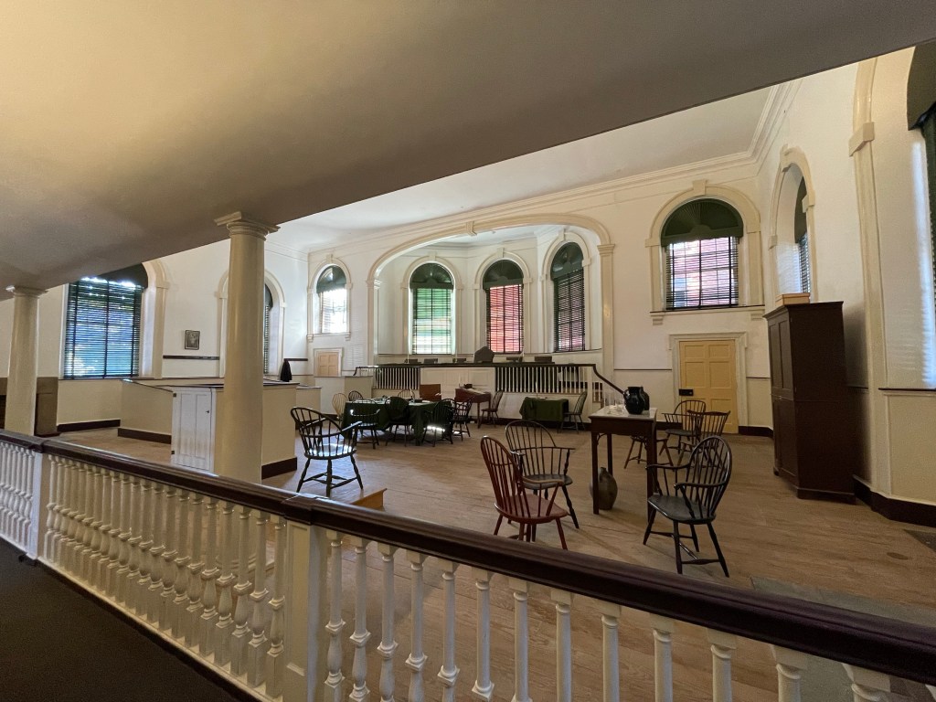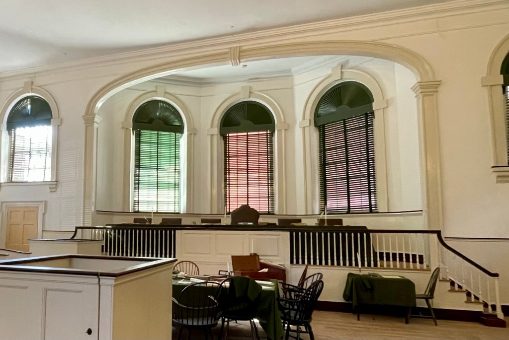 The first Chief Justice, John Jay (co-author of the Federalist Papers), sat in the central chair, with the other justices around him and the lawyers in front. Today’s chamber is set up as a combination of the Supreme Court and the municipal court (which would have used the box and jury seating), which met here until 1854.