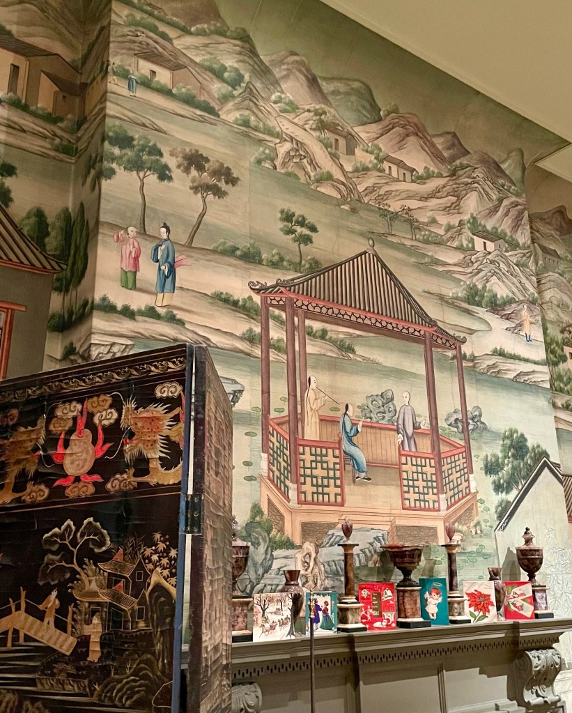 Every room contains amazing objects, but my most favorite was this 1770’s hand-blocked Chinese wallpaper that du Pont’s antiques buyer found in unused rolls in a Paris warehouse. Henry didn’t want to waste any, so had an artist paint over the doors and windows, so the wallpaper didn’t need to be cut.