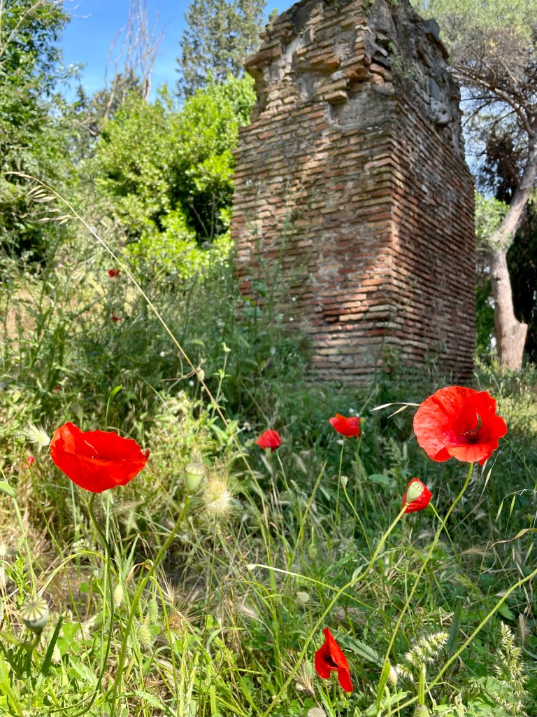 Our June visit coincided with wildflower bloom, so we walked through poppies with the sound of chirping birds, the scent of jasmine, and the occasional feline companion. A totally different experience from the wall to wall tourists in central Rome.