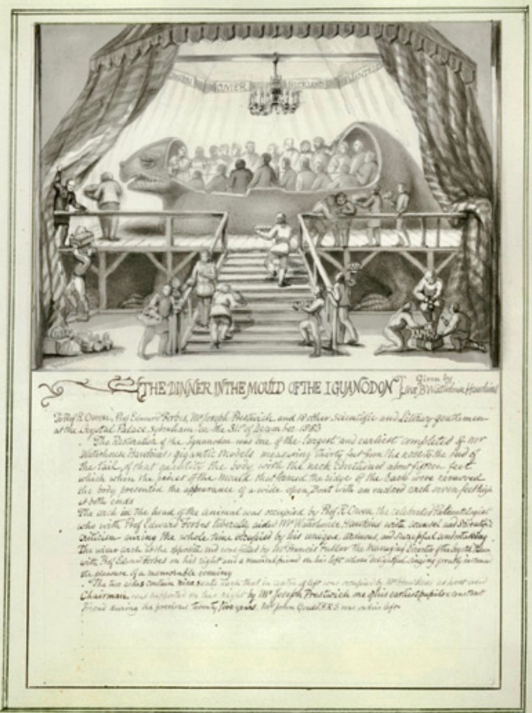 Oh, to have been one of the lucky Victorians to have received an invitation for “…dinner in the mould of the Iguanodon at the Crystal Palace…!” Those lucky few got to dine on mock turtle soup, cod & oyster sauce, woodcocks, snipes, and orange jelly.