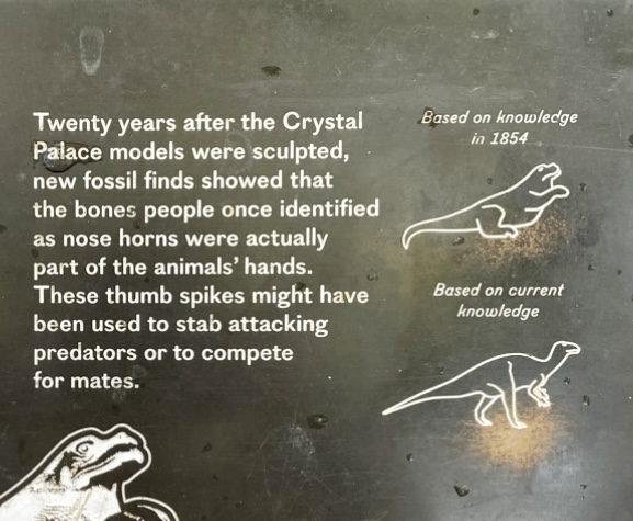 Alas, today we can only view Iguanodon from afar, but at least he’s still around. He and his friends are almost all that’s left of a park created in the 1850’s to house the Crystal Palace, the centerpiece of London’s Great Exhibition of 1851. After the exhibition closed, the palace (the world’s largest glass structure) was moved here to sit in a pleasure ground filled with statuary, fountains, a maze, and a special landscape designed to showcase approximately 30 statues and 5 geological displays illustrating the newly emerging fields of paleontology and geology. These were the world’s first full-scale reconstructions of dinosaurs and related animals. They were so popular that Victoria and Albert visited several times.