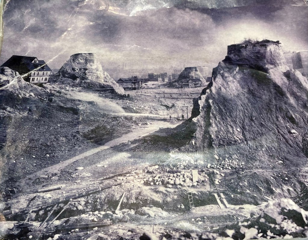 This diagram illustrates the situation in the city for four years following the fire. As they rebuilt in the aftermath of the fire, sidewalks and businesses were at ground level, while the roadway with new sewer pipes was a story above.