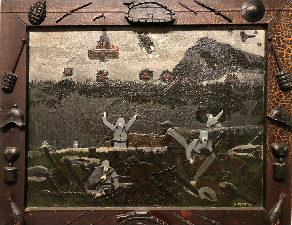 When America entered WWI, Pippin joined the renowned Harlem Hell-fighters, the first African American regiment to serve with the American Expeditionary Forces. Due to segregation in the US Army, the unit was transferred to the command of the French Army where their bravery and ferocity on the battlefield led them to become some of the first Americans awarded the French Croix de Guerre. After losing the use of his shoulder from a sniper bullet (an injury for which Pippin received a Purple Heart), he returned to the US where he taught himself to paint as a form of physical therapy and to help with his battle against depression. Many of his paintings dealt with his experiences of segregation and the difficulties he faced finding employment after returning from Europe.