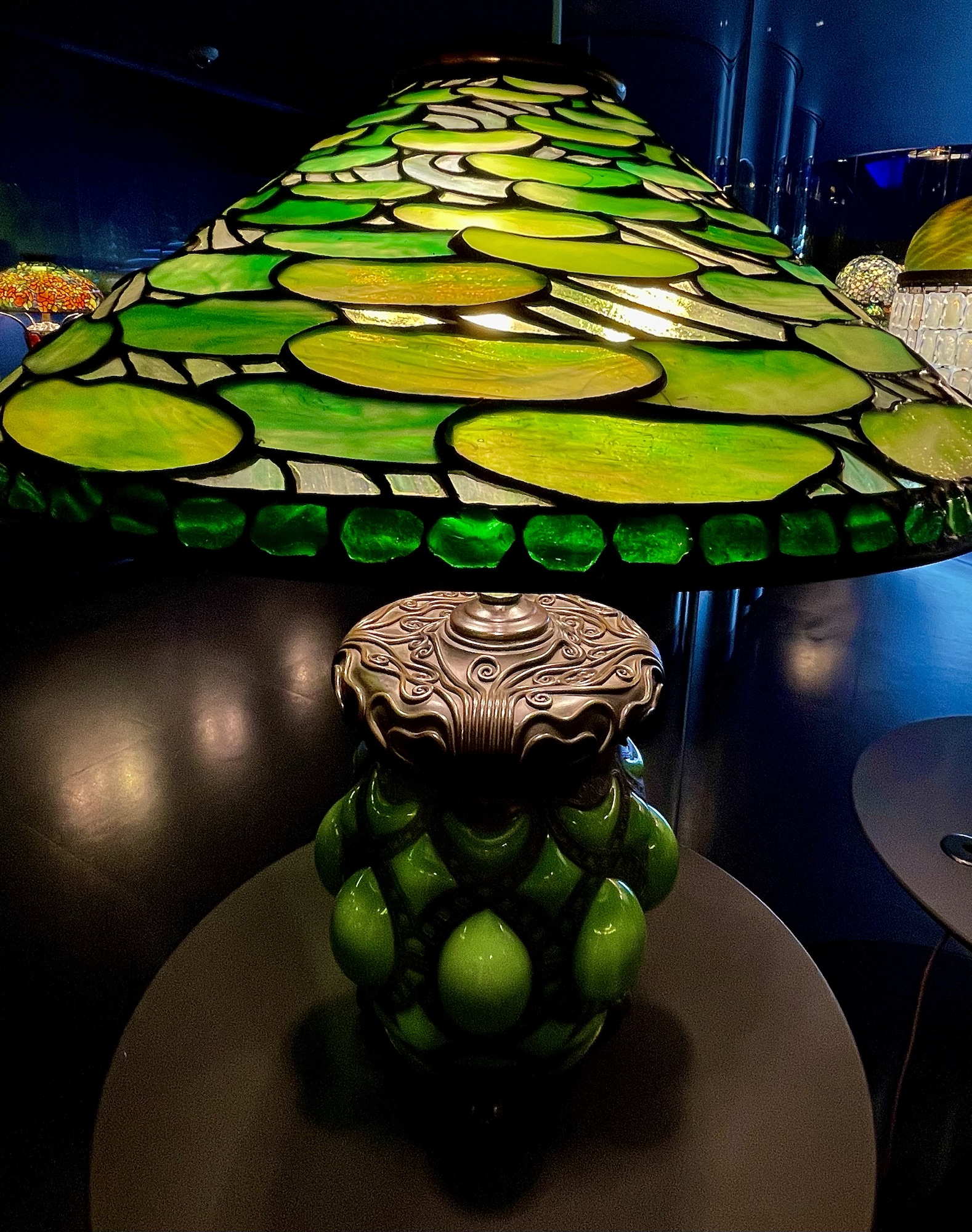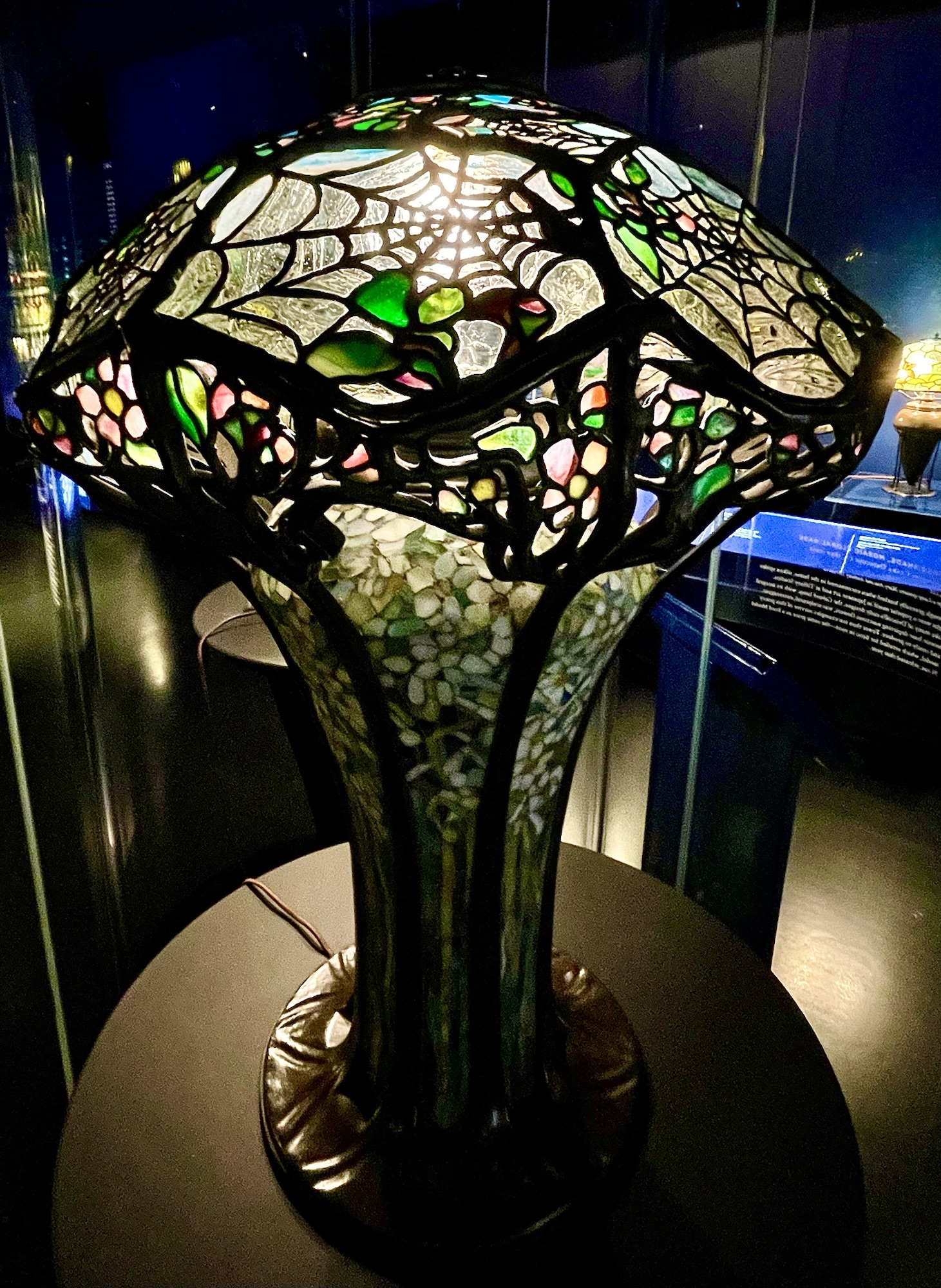 Purchased for only $12.50 at a Greenwich Village shop in 1935, it was the beginning of a lifelong quest. When Eron died in 1984, the collection contained over 350 lamps, as well as a huge collection of glass that was left behind when the glassmaking business closed. The Foundation occasionally offers tours of its warehouse, but the best place in the city to see the lamps is at the Queens Museum and New York Historical Society. The Queens Museum (Queens, NY: The World’s Stage) is located less than two miles from the site of Tiffany’s glassmaking workshops. It is decorated with historic photographs of the factory and showroom, two large cases of Tiffany glass, and, of course, the lamps.