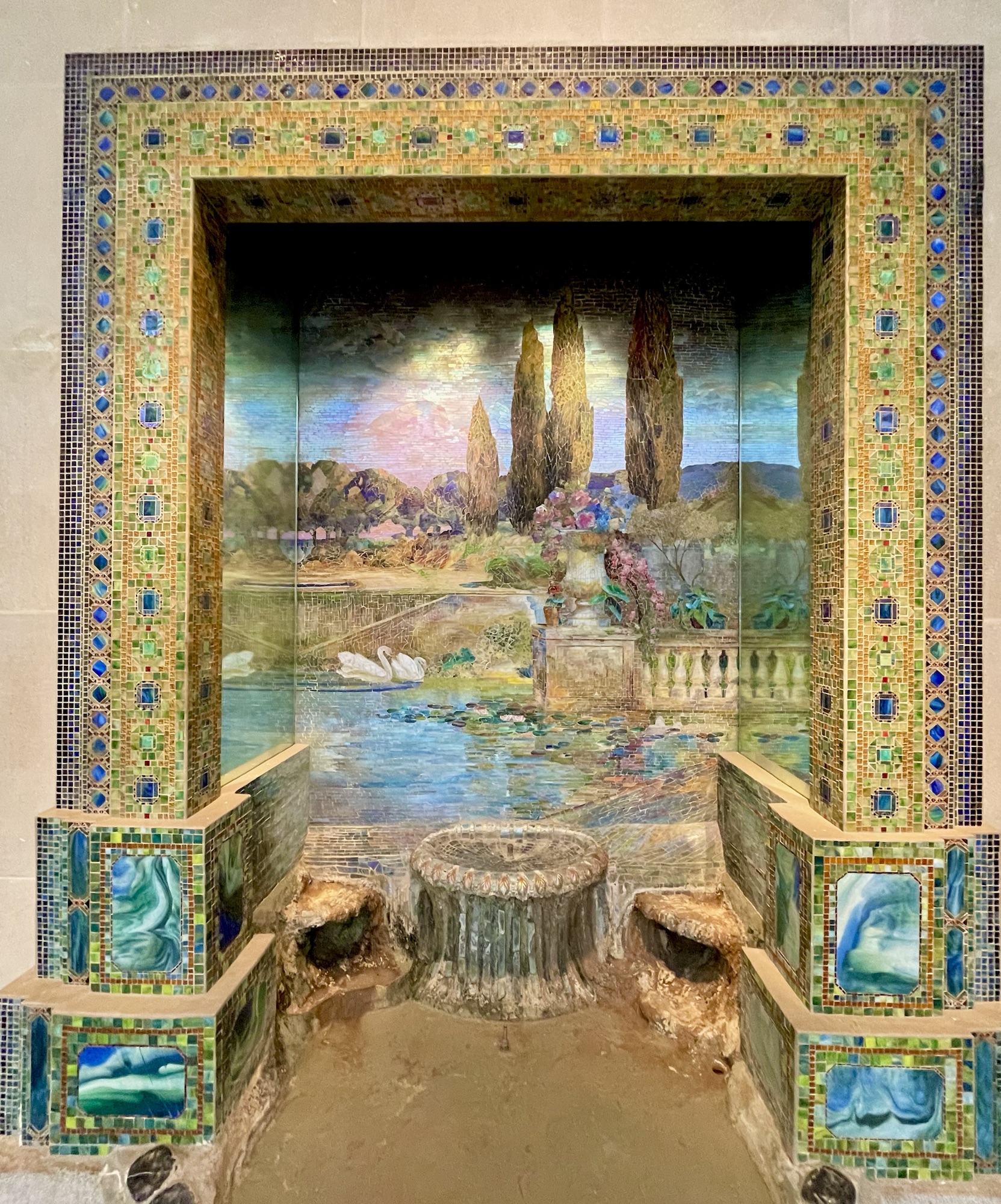 By the late 1910’s Tiffany had fallen out of fashion and the Great Depression finished off the business, which filed for bankruptcy in 1932. Illustrating just how far Tiffany’s work had depreciated is the story of Laurelton Hall, Tiffany’s once fabulous art nouveau mansion on Long Island. The estate cost about $2,000,000 to build in 1905. By 1949 in had fallen into disrepair and sold for $10,000. It burned down in 1957. The remains were taken to the Charles Hosmer Morse Museum in Winter Park, Florida (definitely worth a visit!). They donated the entrance loggia to The Met, where it is on display today: