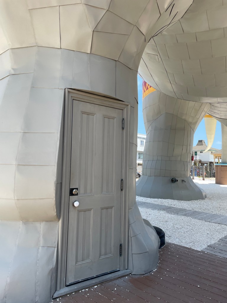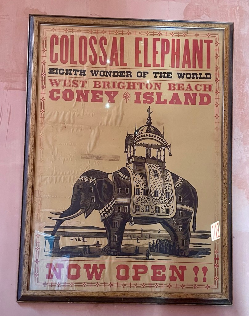 On the wall is a poster for an even larger elephant Lucy’s builder constructed on Coney Island that functioned as a hotel. Sadly, that one burned down in 1896.