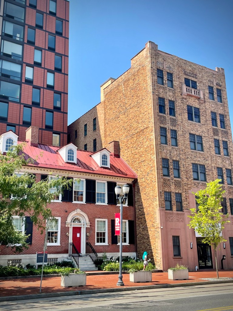 Originally a street of wealthy residential properties, the oldest building on the street today is the 1810 summer house Edward Smith, co-owner of a South Jersey iron foundry. This photo illustrates the age range of buildings along the street, from the early American Smith house, through art-deco, and contemporary.