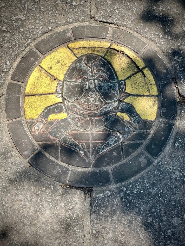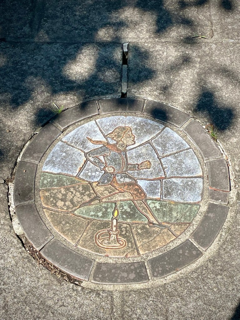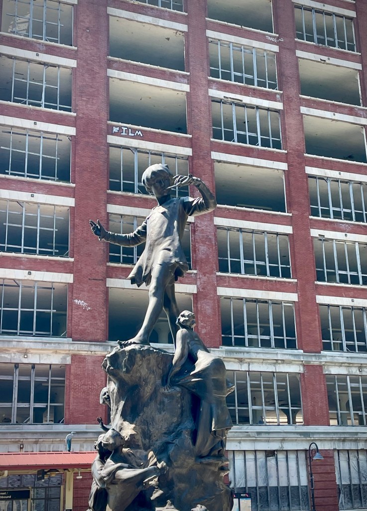In 1918, the company built this building to house a cultural center for its employees. They surrounded it with a community park, wading pool, Peter Pan sculpture, and beautiful Trenton-made tiles of nursery rhymes (Trenton Makes/The World Takes).