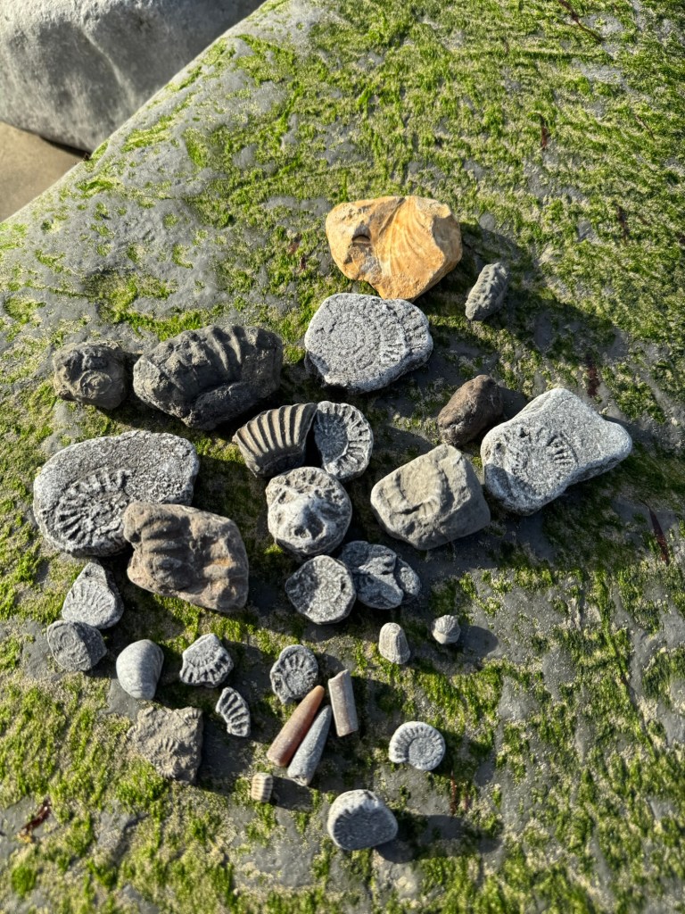Two hours of collecting netted us a handful of fossils: ammonites, a coprolite, a piece of crinoid, belemnites, and a mollusk shell (plus lots of Victorian-era refuse being eroded out of a dump site).