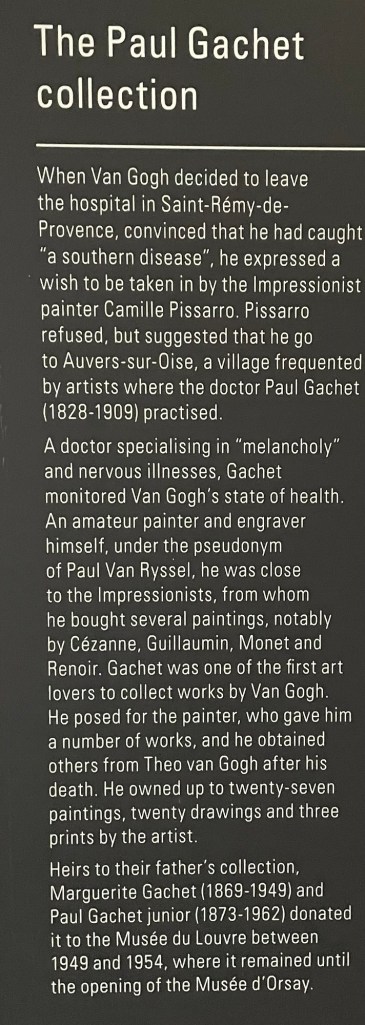 Although van Gogh lived in Paris for only two years, the Orsay Museum contains the third largest collection of van Gogh paintings, thanks to a donation by the heirs of his last doctor, Paul Gachet. Gachet, a painter and collector himself, posed for van Gogh, who gifted him several paintings, and he obtained others from Theo after Vincent’s death. Among other well known works, the museum’s collection includes paintings of Gachet, his wife and their home/garden.