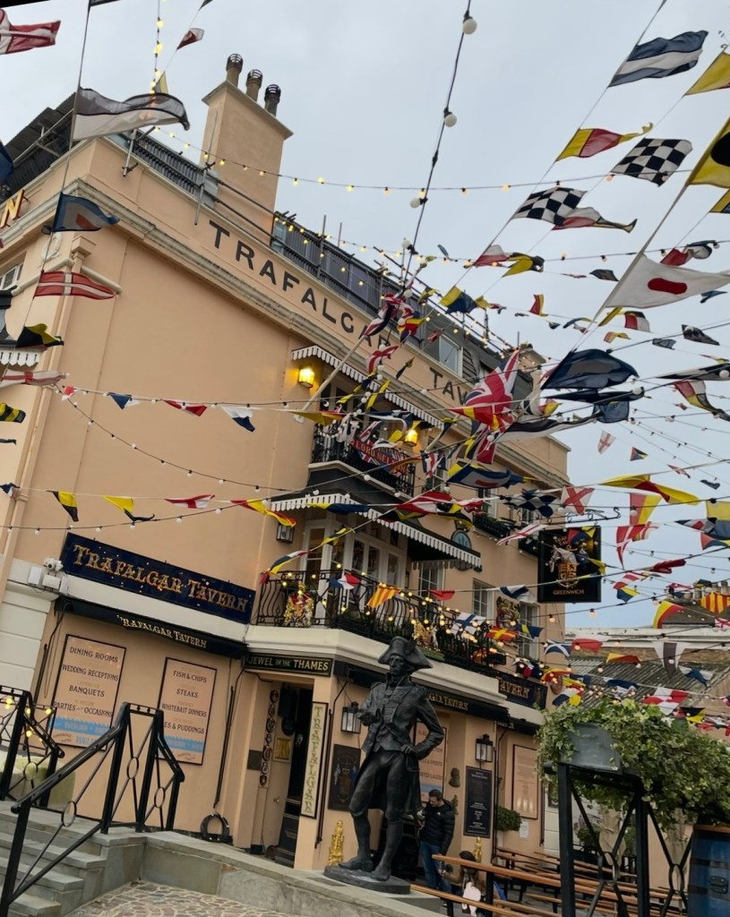 Drink at a Victorian Pub. There are many around the city, but we chose the riverfront Trafalgar Tavern (1837) in Greenwich, which has a log fire and is beautifully decorated for the holidays: