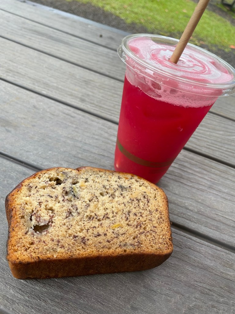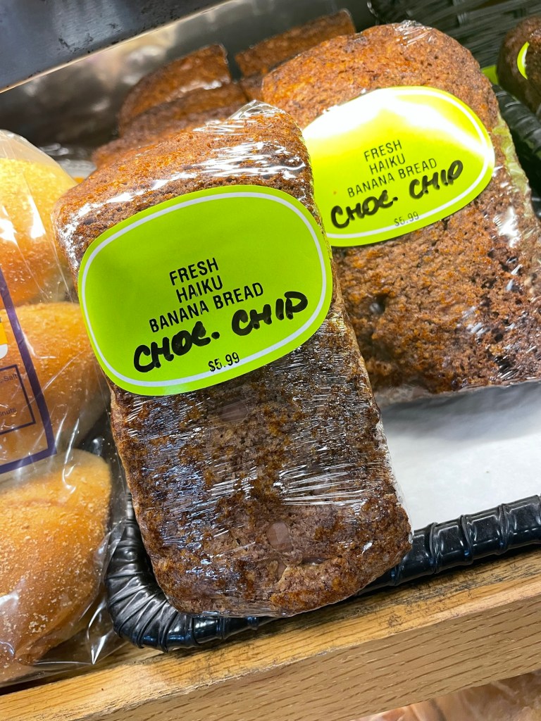 It is because of this abundance and variety that makes banana bread so prevalent here. Everywhere you go (especially on Maui) banana bread is on the menu- in the grocery store, falafel food trucks, fruit stands, and of course almost every bakery. In addition to chocolate chip, many places take advantage of other Hawaiian crops and include coconut and macadamia nut. Because it doesn’t require refrigeration and it doesn’t easily squish, it makes the perfect Hawaiian picnic food!