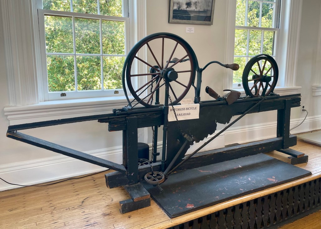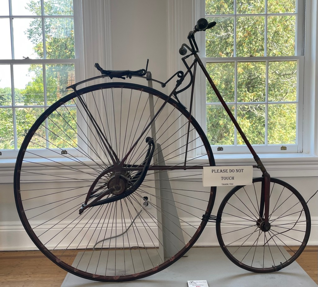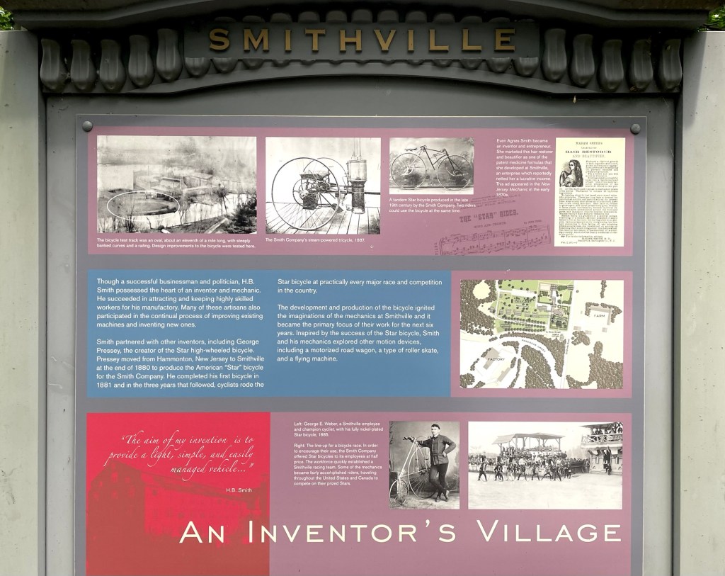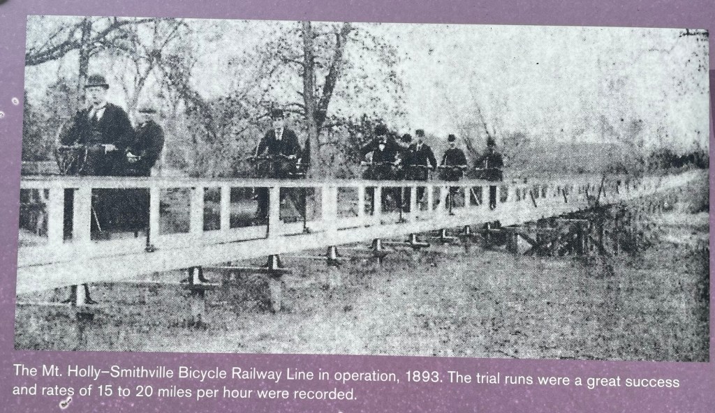 One of the most interesting products manufactured here was the bicycle railroad, the first of which was built here for workers to commute between Smithville and Mt Holly. Unfortunately, it was not financially successful and closed it 1897. You can see a portion in the mansion.