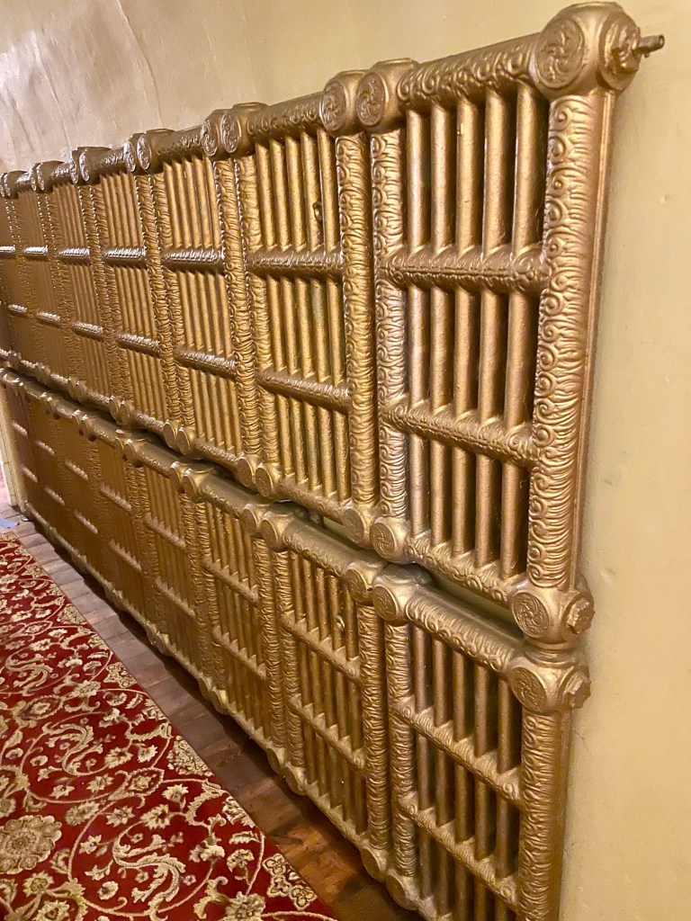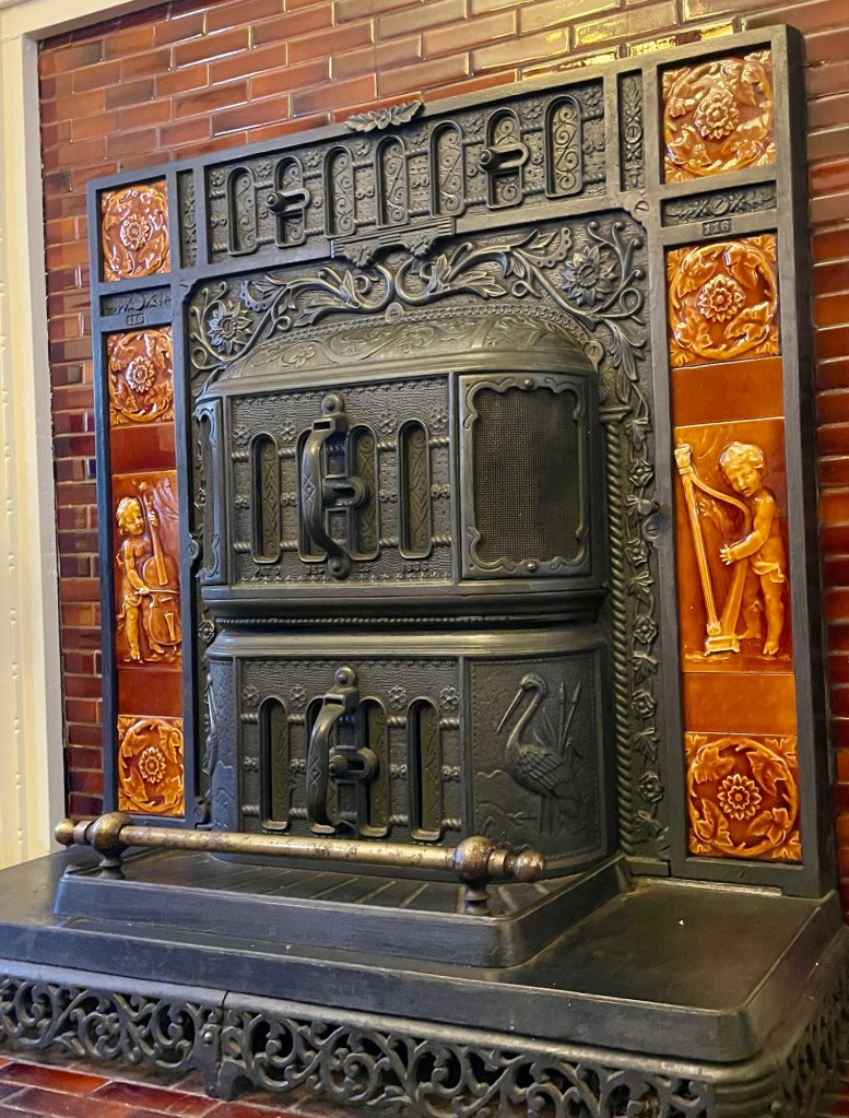 Although many of the cottages and the mansion were built by the Shreve family, interpretation of the sprawling mansion complex dates to the Smith era, when the site was at its peak. Although most of the original furnishings are gone, the mansion is decorated with period antiques and you can see portraits of Hezekiah and his “wife” Agnes, the original woodwork, and these amazing radiators and fireplaces, which were products of the Smithville factory (with Trenton-made tiles).