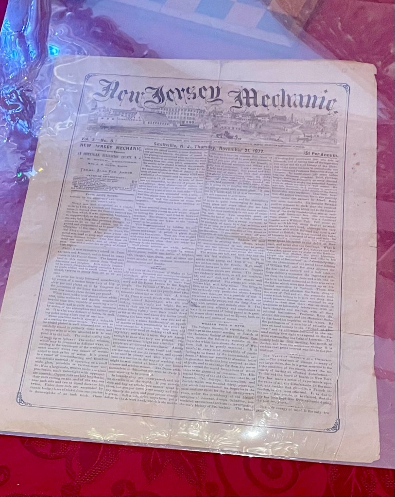 Agnes herself was quite a woman. She began life as a mill girl in a Massachusetts factory, but after her “marriage” to HB she went on to study medicine at Penn (and provided medical care to workers in the village), wrote and edited the “New Jersey Mechanic,” and became an inventor, creating a hair restorer and beautifier.