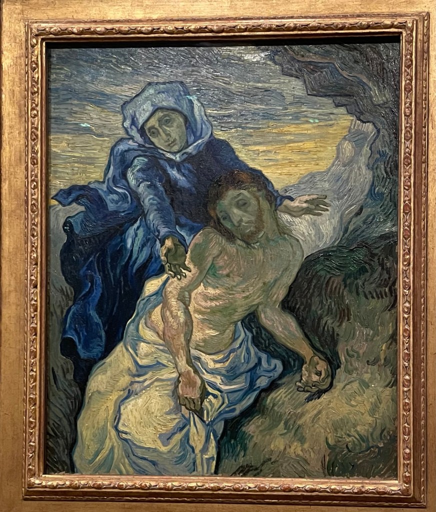 There is also a section devoted to paintings by van Gogh’s friends and colleagues. Gauguin’s Vincent van Gogh Painting Sunflowers, plus the amazing pair of Bernard’s self portrait with Gauguin and Gauguin’s self portrait with Bernard illustrate the close relationship between the artists painting in Paris in the late 1880’s