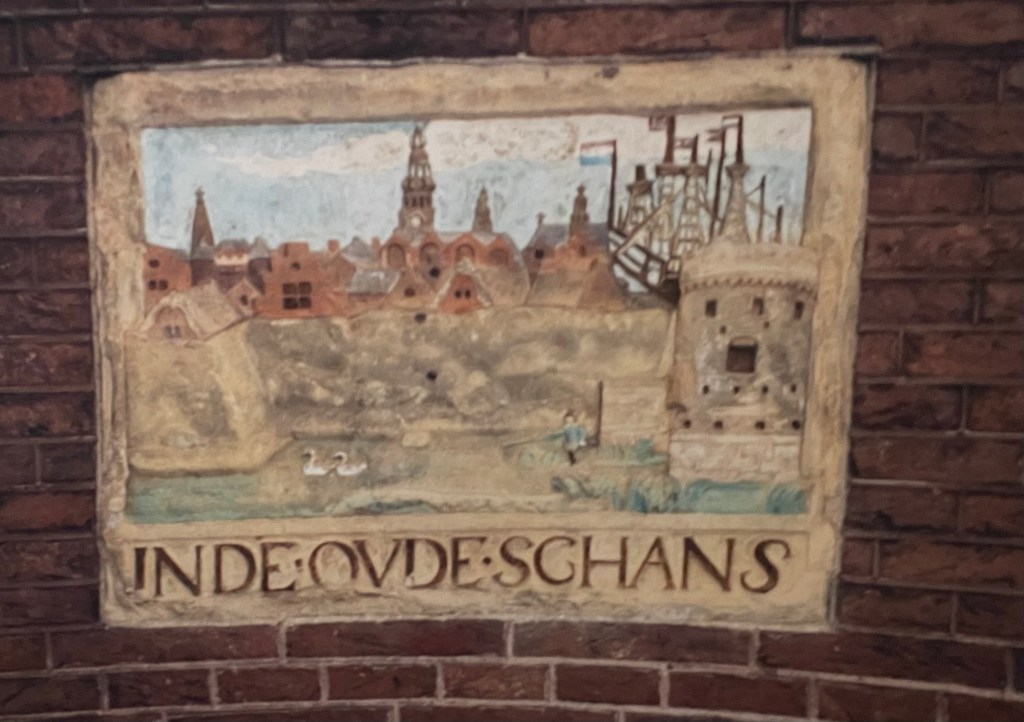 This stone refers to the legendary founding of Amsterdam by two fishermen looking to escape a storm in the Zuiderzee. The story goes that their sea sick dog jumped ashore and vomited at the spot where the city was founded. Note the tiny dog’s head under the left side fisherman’s sheild!