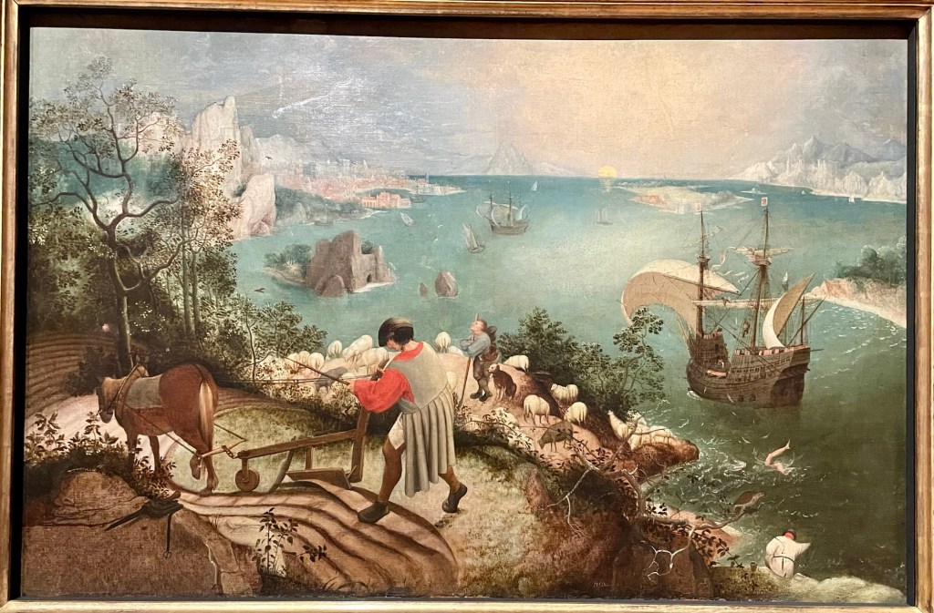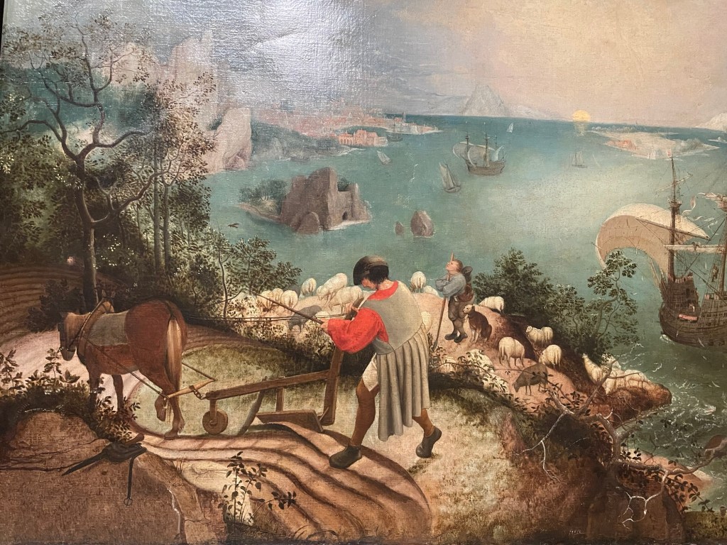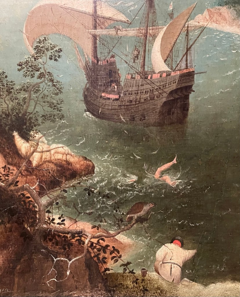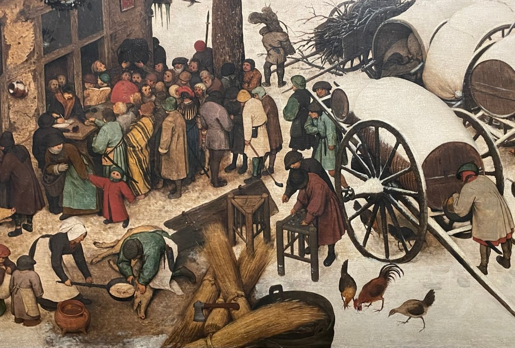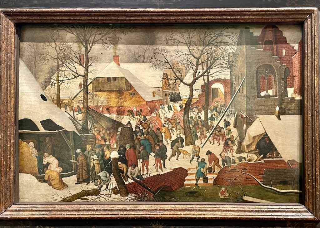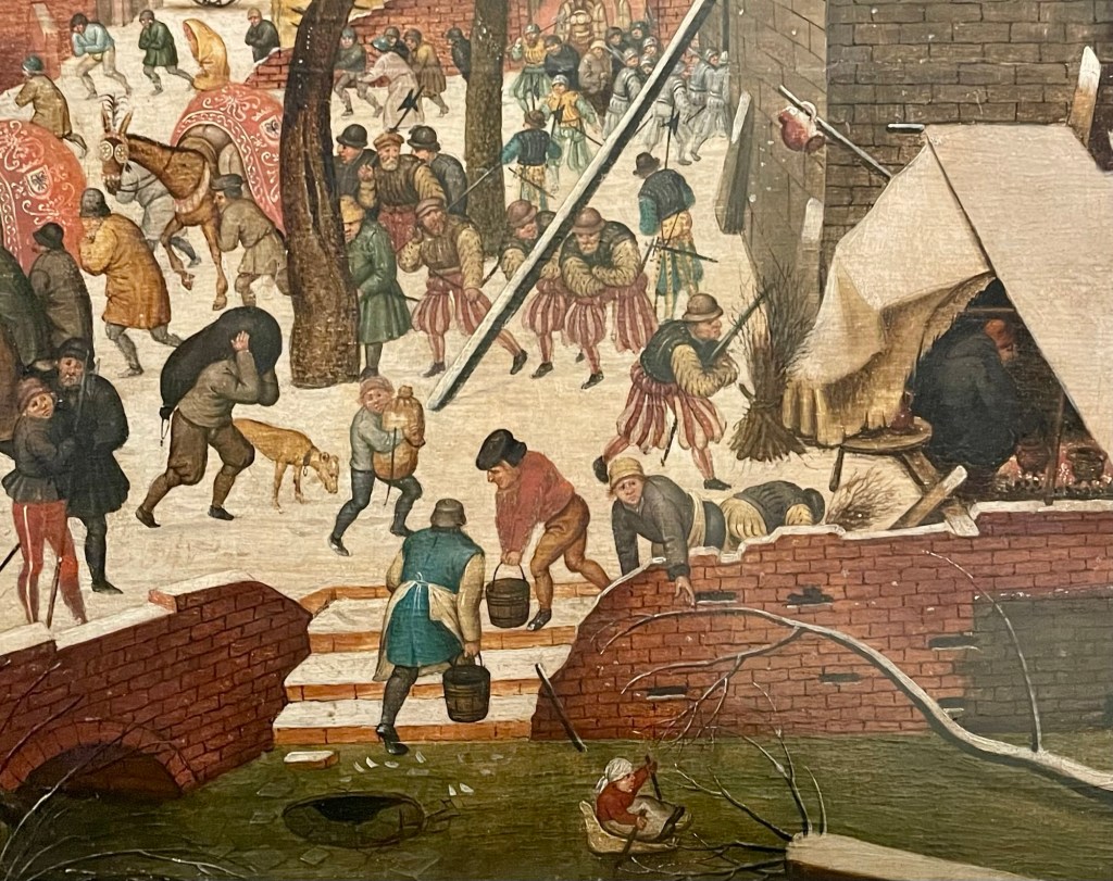 Even in his painting of “The Adoration of the Magi in the snow,” (the one in this gallery is a copy by his son Pieter), the religious drama takes place almost out of sight, tucked away in the dark in a bottom corner while the majority of the canvas is devoted to the townsfolk leading their own everyday lives, from the child playing on the ice to the adults’ focus on getting water and gathering wood for warmth.