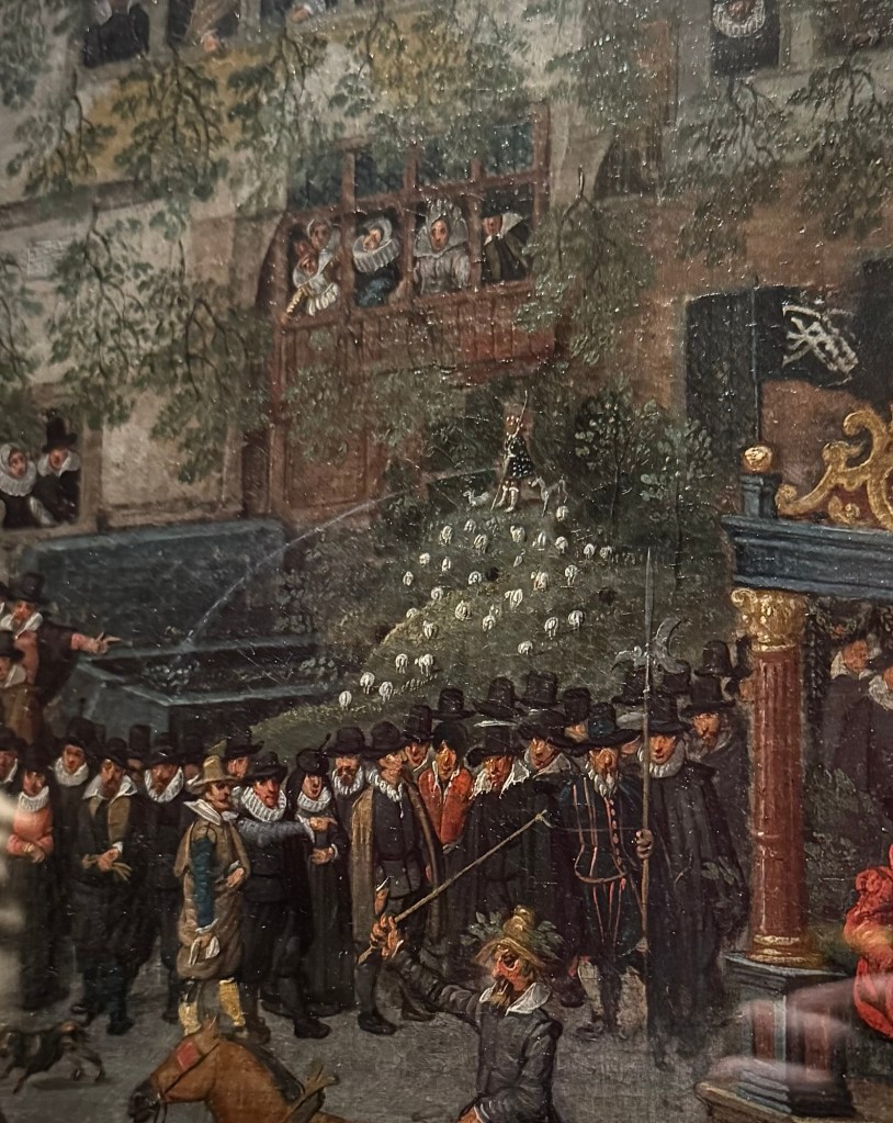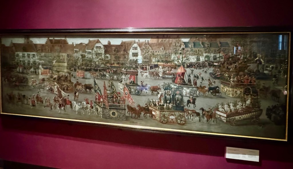 The fountain’s existence dates back to at least the mid-15th century, recorded in a c.1451–52 document regarding water lines supplying the fountains of Brussels. He’s been sporting outfits for much of this time, shown here in a 1616 painting by Denis Van Alsloot of the Ommegang religious procession.