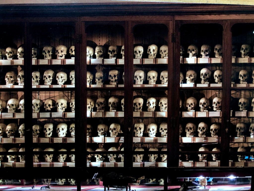 Philadelphia’s Mütter Museum is an excellent example of a Victorian-era cabinet of medical curiosities. No pictures allowed, so this is a postcard of their 19th century Hyrtl Skull Collection. Lots more objects, including drawer after drawer of swallowed foreign bodies removed by their collector, Dr. Chevalier Jackson (Philly’s Creepiest Museum – The Mutter Museum).