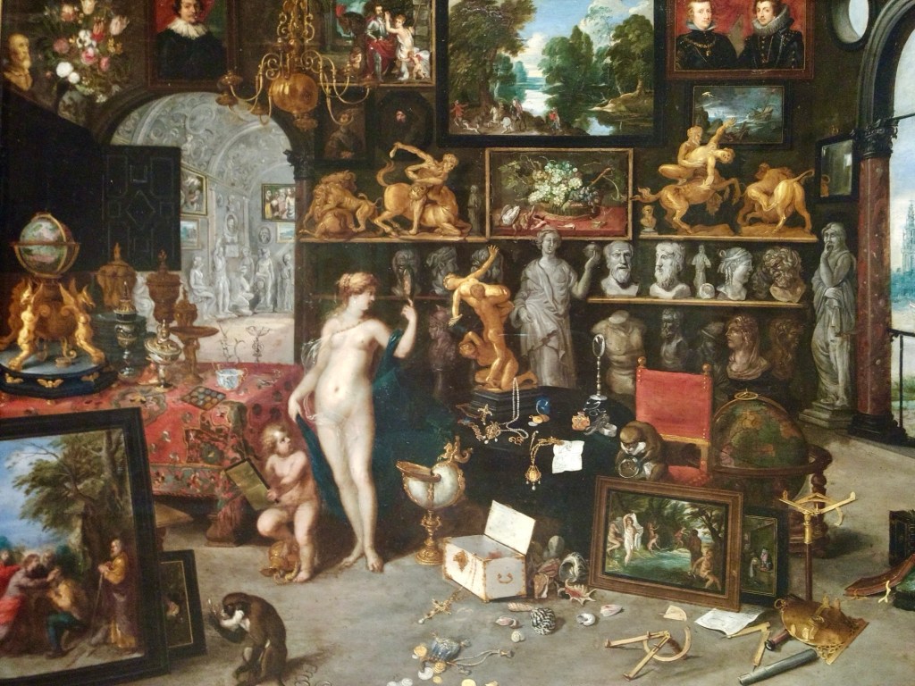 Modern museums grew out of these Renaissance collections of weird and wonderful objects. Also called Kunstkammer (art chamber) or Wunderkammer (room of wonder), they displayed the marvels of the Age of Exploration – exotic natural specimens, man-made works of art, ethnographic items, and scientific instruments. All of these can be found in this 1660 painting by Jan Brueghel the Younger: shells, monkeys, paintings, jewelry, silver, telescopes, magnifying glasses, astrolabes and globes.