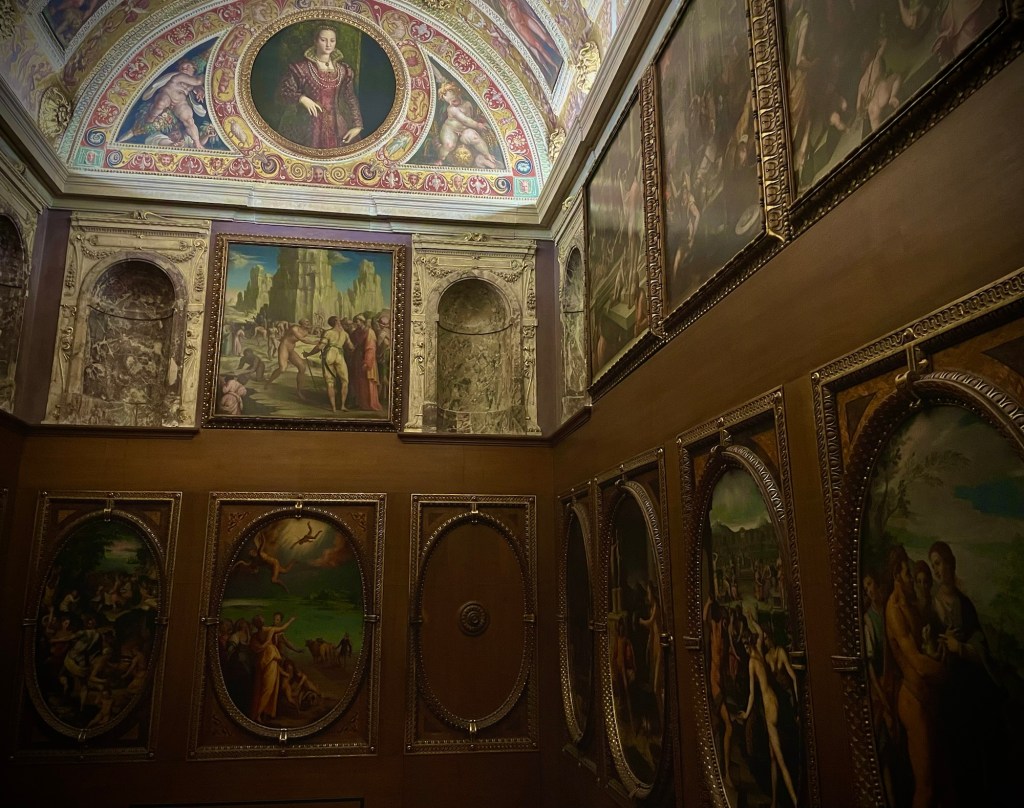 Sometimes the rooms were simply wall to wall paintings, which later developed into the salon-style of decorating, with objects hung close together from floor to ceiling.