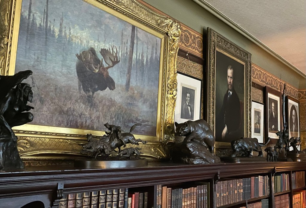 This was Teddy’s family retreat, built in 1885. My favorite room was the library which became Teddy’s summer office while President. In addition to the portraits of his heroes overlooking the desk, the desk holds Teddy’s coffee mug. He drank a gallon each day – which might explain how he had the energy to accomplished so much! The telephone was added during his presidency.